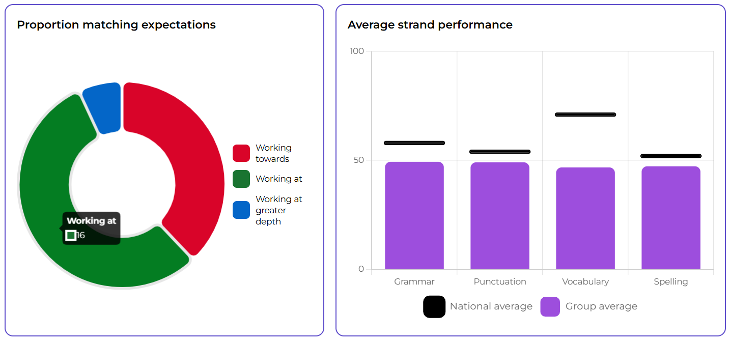 The Group report shows the performance summary of learners in a group or class for a specific test, including the proportion of learners working below, at, or above expectations and the group’s average strand performance. For every learner you can review their raw score, relevant standardised scores and the number of marks awarded for each strand.