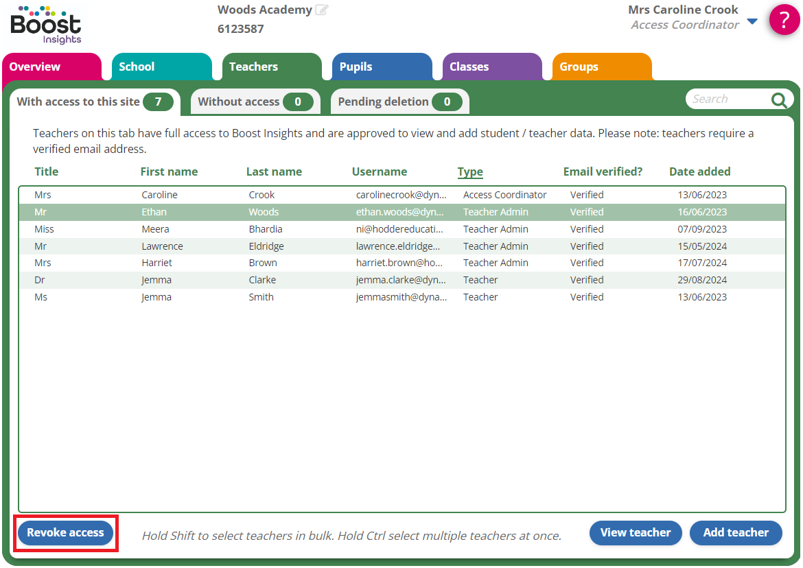 If a user no longer requires access to Boost Insights but does to other Hachette Learning platforms, revoke their access instead.