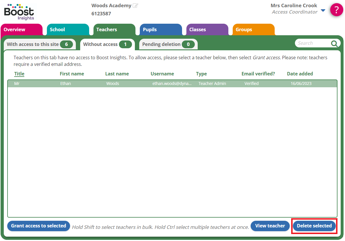The Access Coordinator can permanently delete users in Boost Insights.