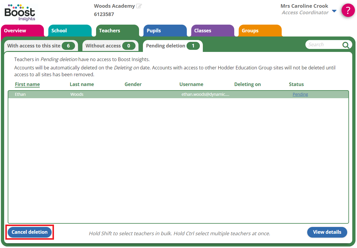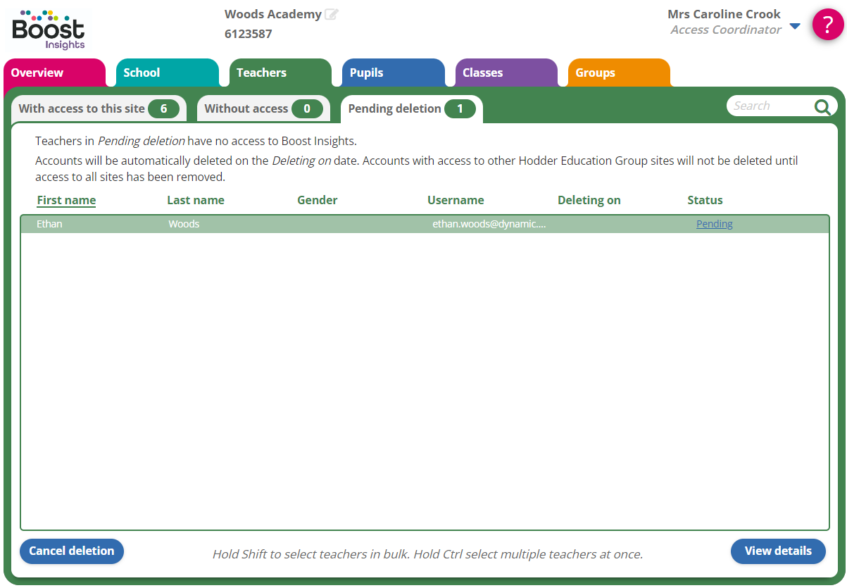 Deleted users will sit in the 'Pending deletion' tab for six months before being automatically deleted. They will not be able to log in to the platform during this time. If you need to delete someone immediately, submit a GDPR consent form to the digital support team.