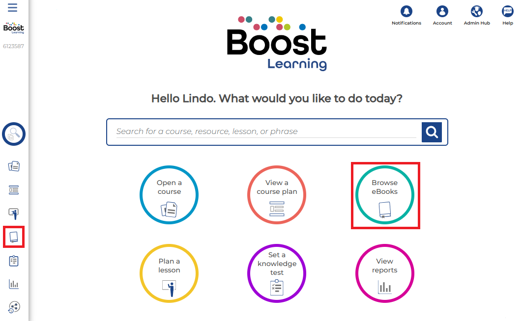 To view all the eBooks ordered to your school's account, log in to Boost Learning and click Browse eBooks on the main dashboard or the 'eBook' icon on the sidebar.