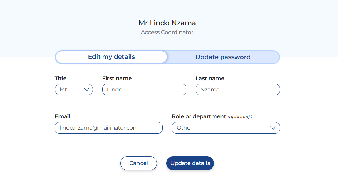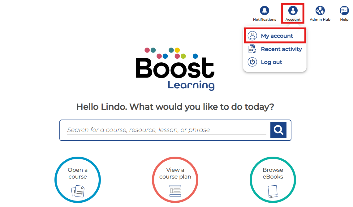 You can update your name, department, email address, and password in Boost Learning by clicking Account > My account in the top right corner of the teacher dashboard.