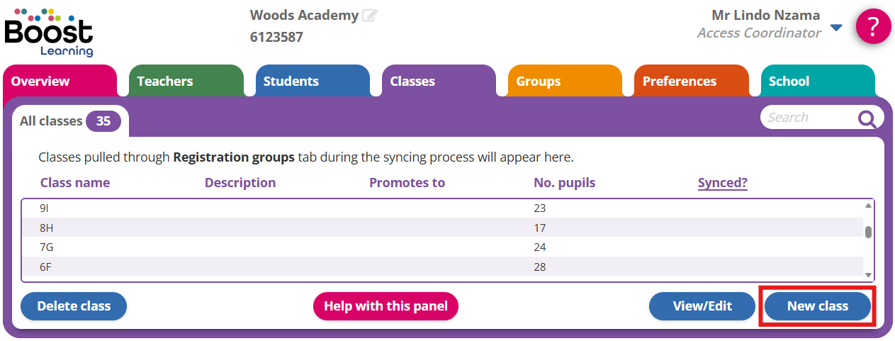 To delete a class, empty it of learners, then select it and click Deleted selected.