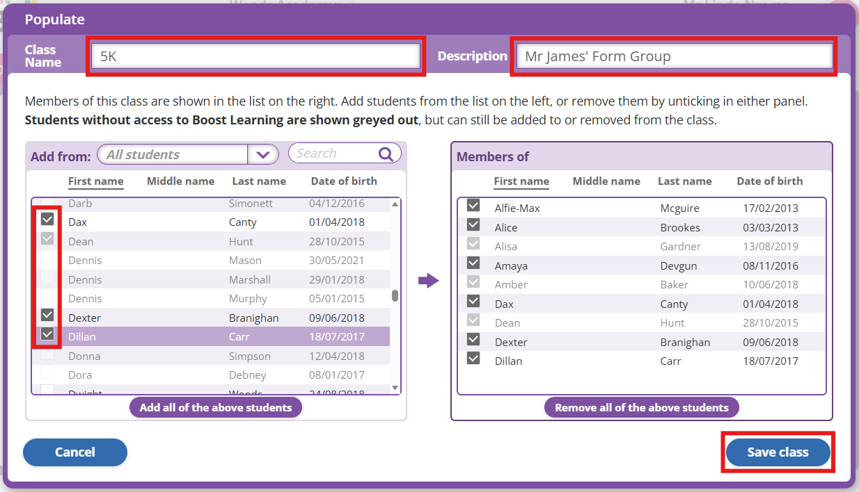 - Tick students on the left that you'd like to add to the class. (Optional)